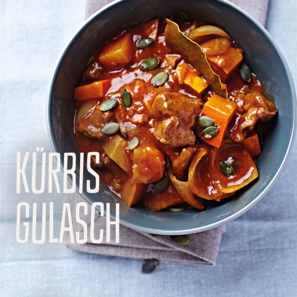 Zutaten: 1 kg Rindergulasch 600 g Hokkaidokürbis 2 Knoblauchzehen6 rote Zwiebeln 1 Lorbeerblatt10 g Rosmarin 10 g Thymian 4 EL Pflanzenöl zum Braten 3 EL